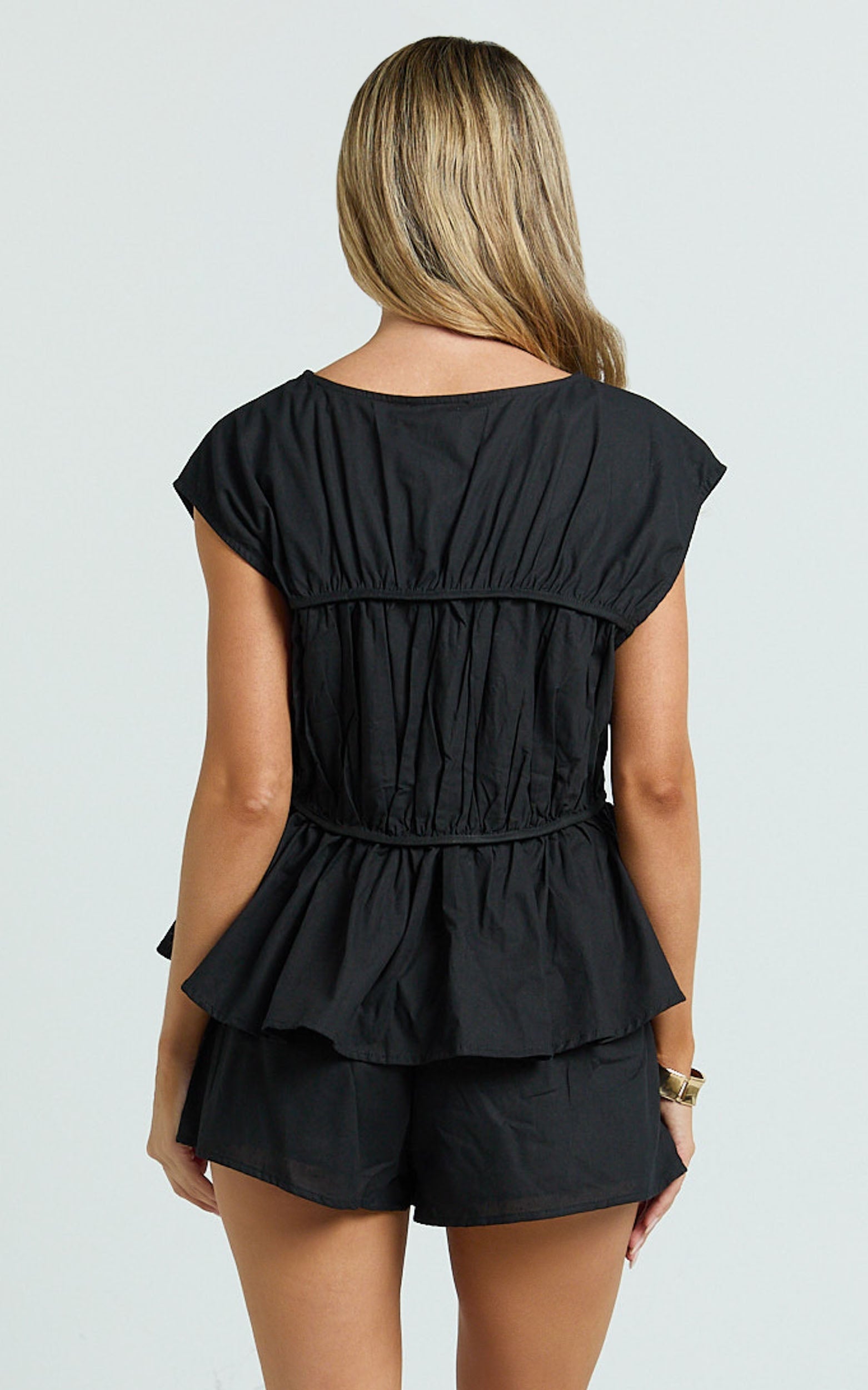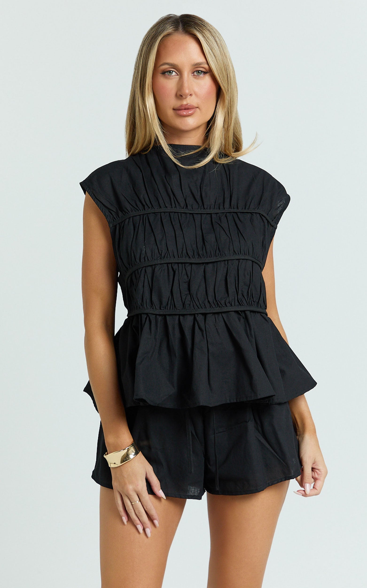 Conjunto de dos piezas: top con detalle fruncido y pantalones cortos en color negro.