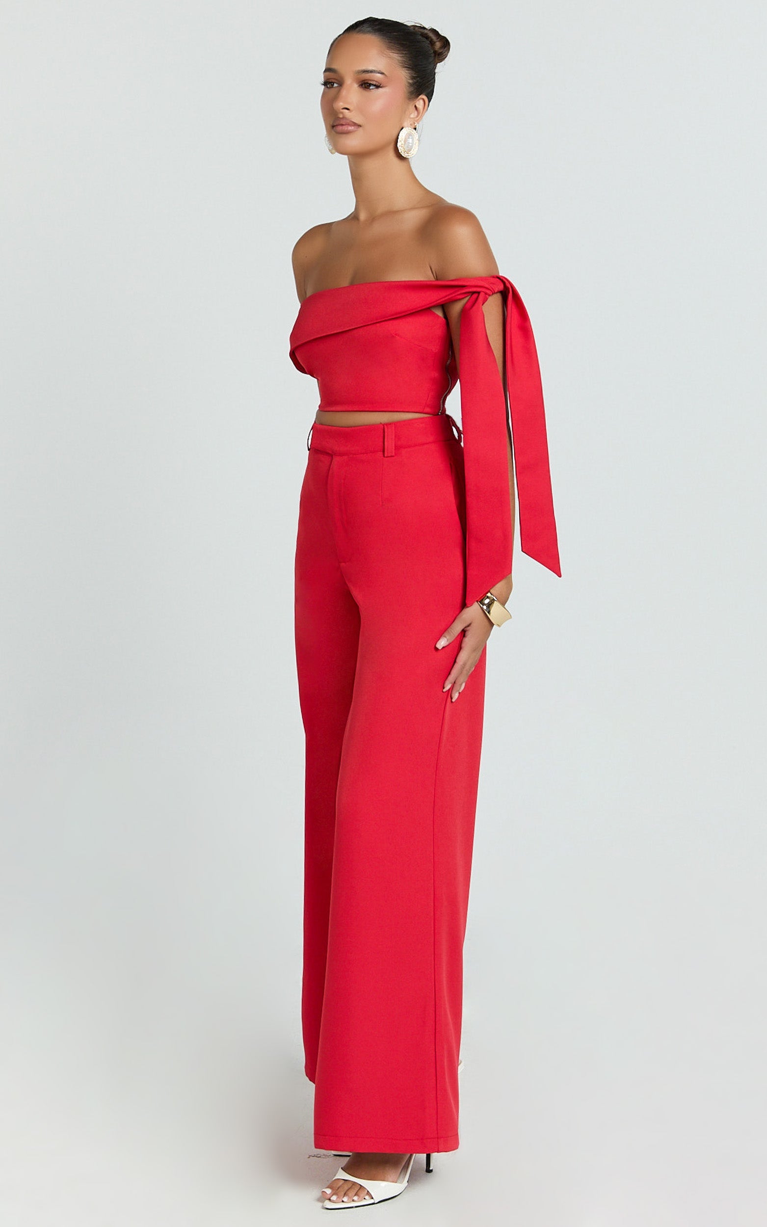 Conjunto de dos piezas: top con detalle de lazo en los hombros y pantalón entallado en color rojo.