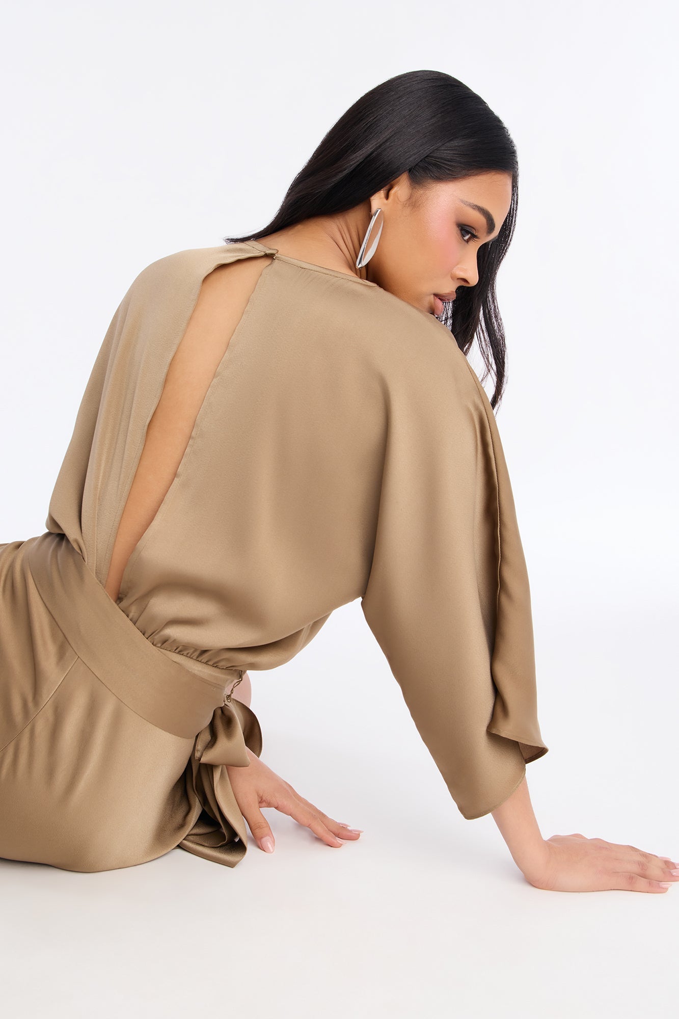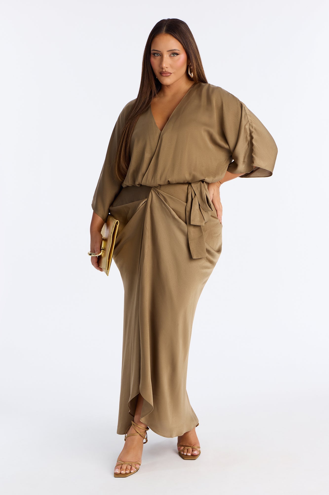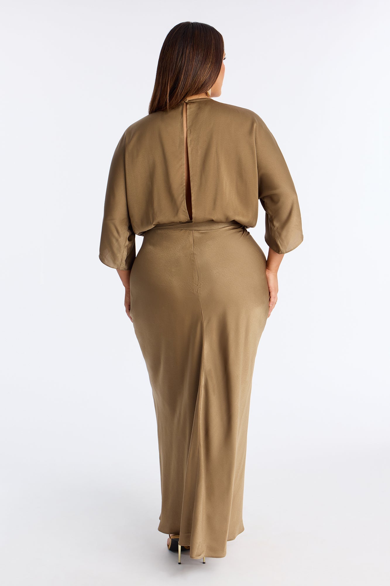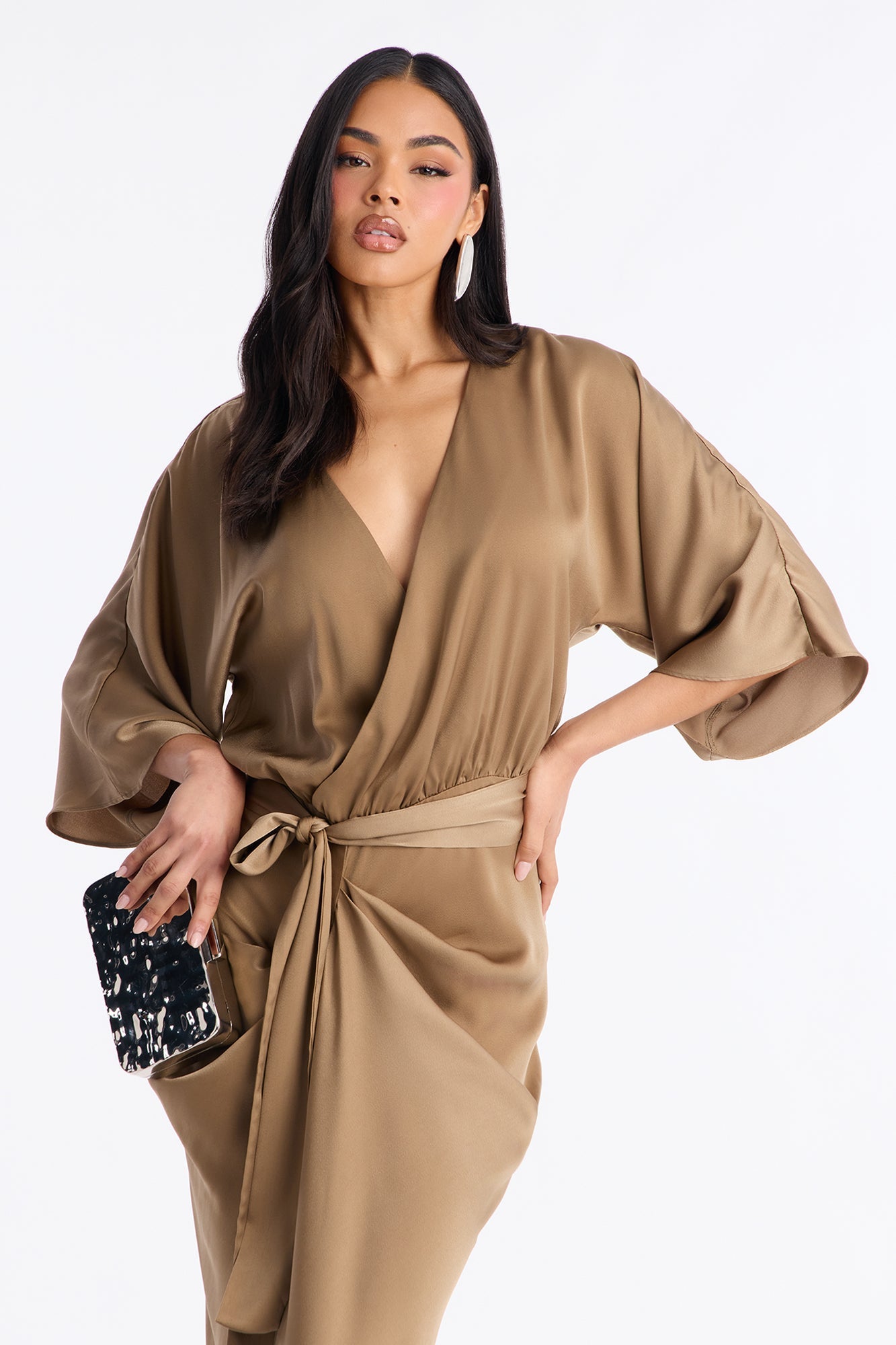 Este vestido largo en tono marrón mocha destaca por su elegancia minimalista y su silueta fluida. Presenta un escote cruzado en forma de “V” que realza el escote de manera sofisticada, mangas amplias tipo kimono que aportan movimiento y un cinturón del mismo tejido que se anuda a la cintura para definir la figura. La falda envolvente cae suavemente hasta los tobillos, creando una línea estilizada y femenina, ideal para eventos formales o una ocasión especial de noche.